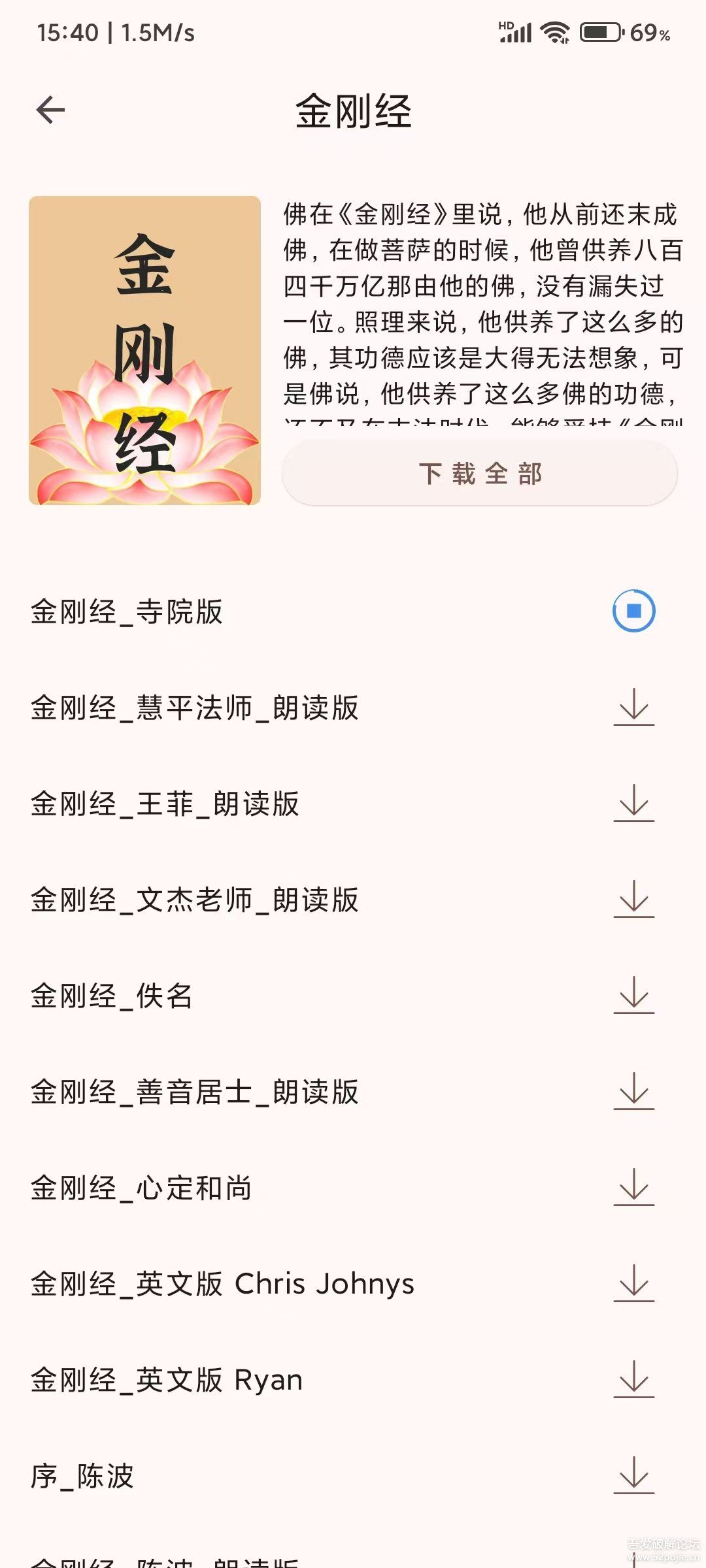 ★ 佛经可能会有很多版本,如果要单独下载某一版本,可以点击版本条目后面的下载按钮即只下载该版本。
